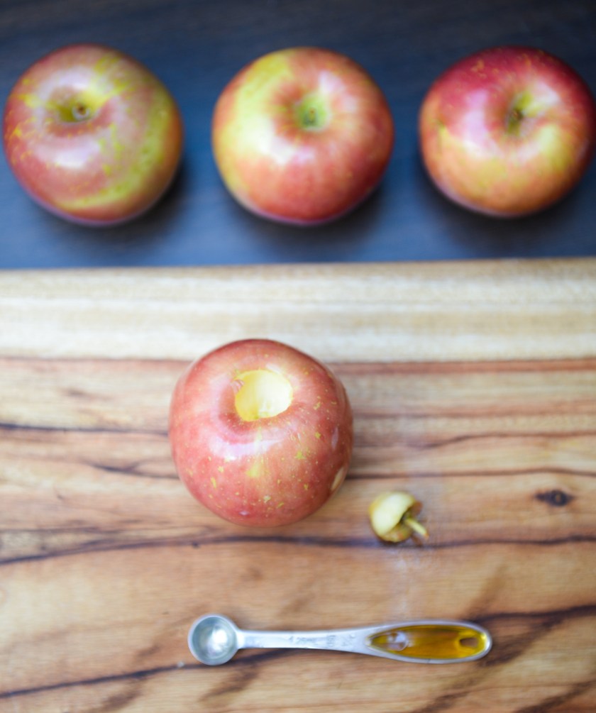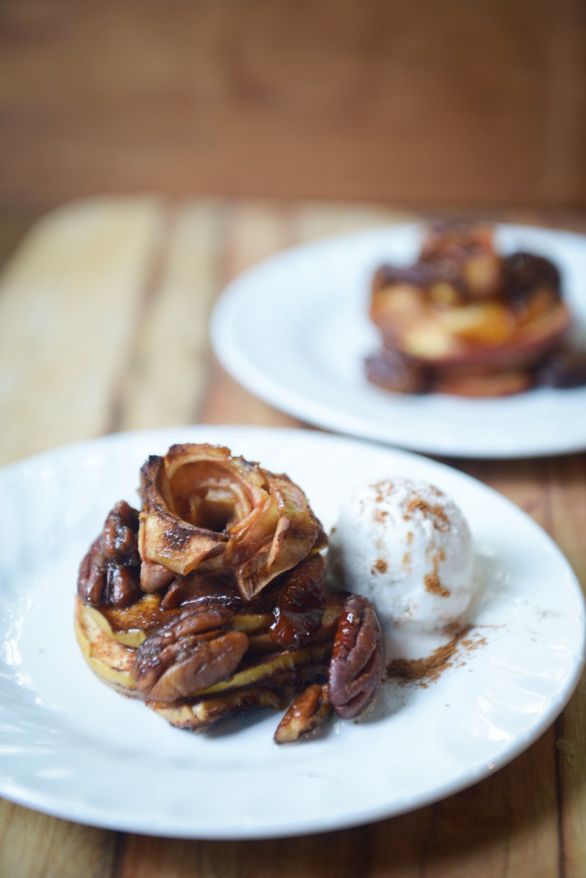 In a pan, add the coconut oil and brown sugar, heat and stir until it reaches a syrup consistency. Add a pinch of cinnamon and the pecans. Take the apples out of the oven and drizzle the candied pecan mixture over each one. Bake an additional 5 minutes.