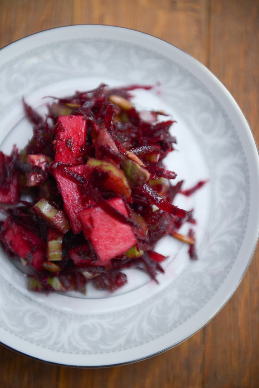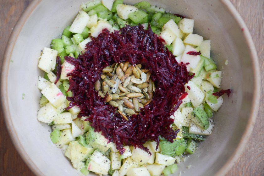 After the Holidays (a.k.a. the universal feasting marathon), January is usually a time to reboot. What better way to start your year off than with clean eating and lots of organic fruits and vegetables? The “juicing” craze is alive and well in Los Angeles and many of our favorite juice shops are promoting a New Year’s Juice Fast/Detox to help you kick-start your resolutions. More than just a diet fad, juicing is a quick and delicious way to get those healthy vitamins delivered right where you need them. Inspired by detox juices but wanting a little more “bite”, I created a detox salad that has all the delicious sweet and savory flavors of an apple & beet juice, but with all the fiber and crunch of actually eating food…so you leave fully satisfied.
