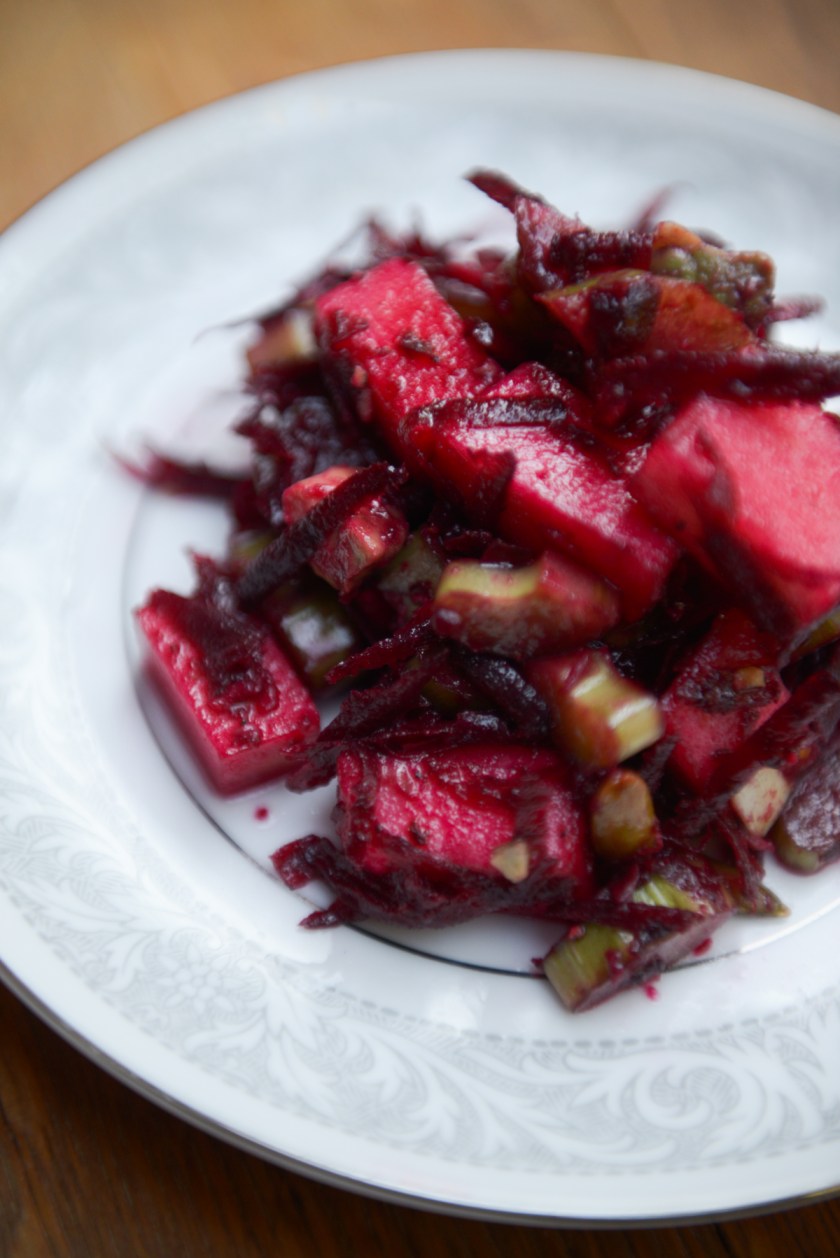 TIP: Fuji apples are used in this recipe for their sweetness, versus Granny Smith apples which are tart. The sweetness of this variety of apple balances the root flavor of the beet and the tart flavor of the lemon.