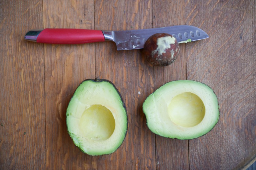 Cut your ripe avocado in half length-wise. Tap your knife into the seed and twist. It should come out easily. Draw a grid into your avocado half, with a small knife and use a spoon to scoop out the avocado from the skin. Add the avocado chunks to your salad.