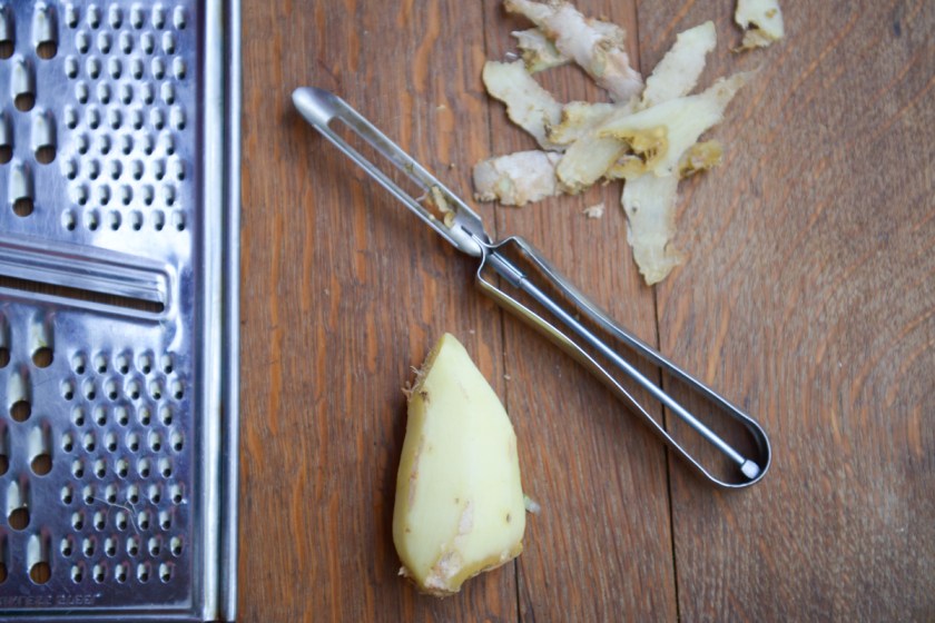 Peel the skin off of the ginger root and use a microplane grater-zester or a small-holed grater to finely grate the ginger root over the bowl.