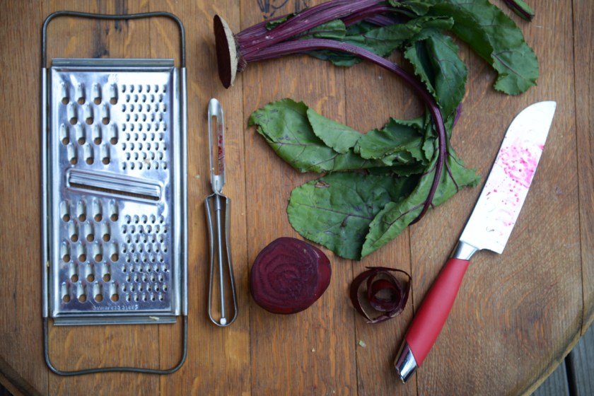 Chop the tops and tail off of your beets and peel the skin with a peeler. With a cheese grater, grate your beets over the salad or onto a metal or glass bowl. Add to your salad.