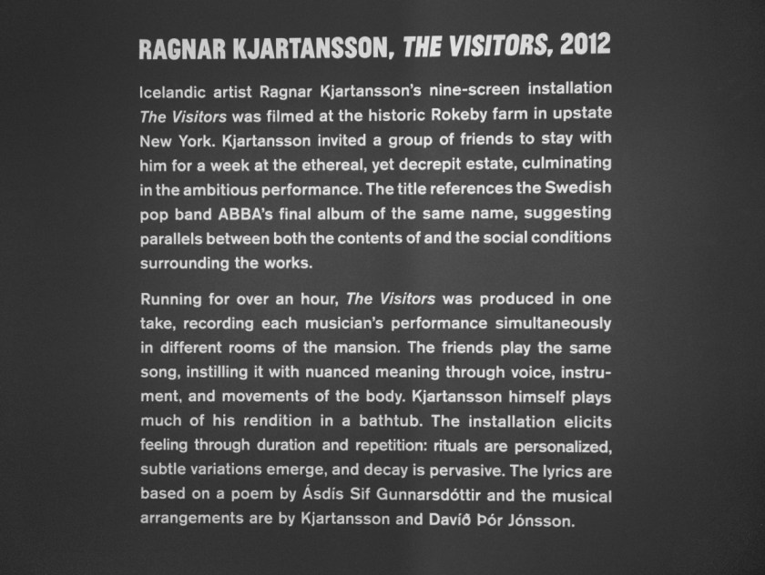 Ragnar Kjartansson’s The Visitors is by far our favorite piece in the museum. The nine-screen video installation of individual musicians playing the same song together from remote rooms is indescribably moving. Indescribable because it just has to be experienced. But if you can imagine being physically wrapped up in a lullaby, that’s kinda what it feels like–dreamy, other-worldly and completely entrancing. With a runtime of over an hour, you can have as much or as little of the experience as you want. We like to keep checking in throughout our visit, to continue getting snippets as it progresses. Just try to walk away without humming “my feminine ways…” aloud to yourself for the rest of the day, no matter if you’re a siren or a scoundrel.