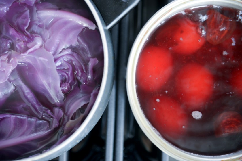 Cut the top off of raw beets and peel off the skin with a peeler. Chop the peeled beets into chunks. Boil them in water and 1 Tbsp of white vinegar with 6 eggs 12-15 minutes…this should produce a lovely pink coloring.