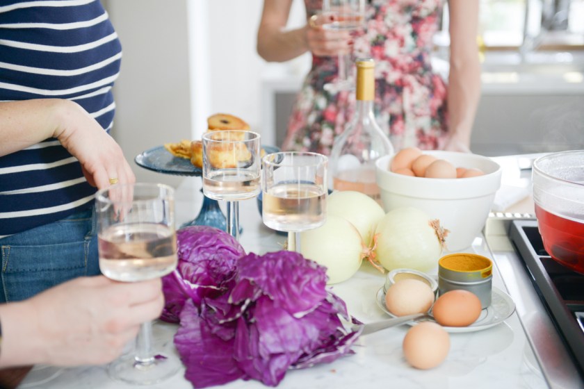 Now comes the fun part. Once the eggs are dyed and cooled to room temperature, invite over all your loved ones for a potluck picnic and craft party. Our afternoon of kitchen experiments worked up our appetite, so we set up a picnic in the backyard and let the decorating begin. Cheese, fig jam and gluten-free treats where a great accompaniment to our French tunes & Rosé for our afternoon art day. Experimentation continued as I smeared herbed goat cheese on everything from boiled eggs to crunchy purple cabbage leaves (a great alternative to a cracker).