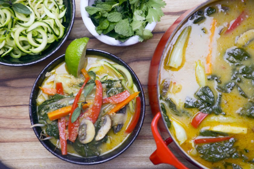 With the Daylight Savings time change and spring just flying by, I perk my head up each evening and laugh in disbelief that it’s practically May already, y’all! With all the flurry of fun activity that comes with the lengthening spring sun, it’s usually 8pm before I finally notice the sun has gone down and it’s time for dinner. So quick and easy recipes like last week’s Chia Pudding become a staple or I end up busting out the take-out menu for some instant, warm comfort food. But what’s to be done when you’re craving the entire Thai menu? Or you can’t decide between the Thai curry or grabbing some hot Pho on your way home? This conundrum plunged me deep into some kitchen playtime this week. I thought: what can I make that gives me all my favorite Thai take-out items in one dish, but has no msg and is gluten-free, low-carb and vegetarian for all my veggie friends? And voilá–Thai Curry Vegetable Soup was created!
