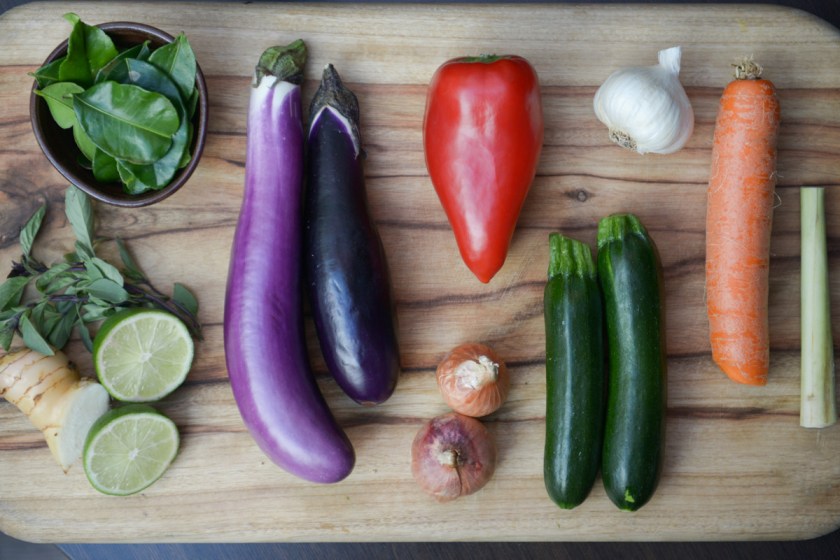 After the broth has simmered for at least 35 minutes, increase the heat to medium. Add the chopped Mushroom, Eggplant and Carrot. After 10 minutes, add the Red Bell Pepper & Bok Choy. Cook for an additional 5 minutes right before serving. Remove the soup from the heat. Add the juice of 3 limes.