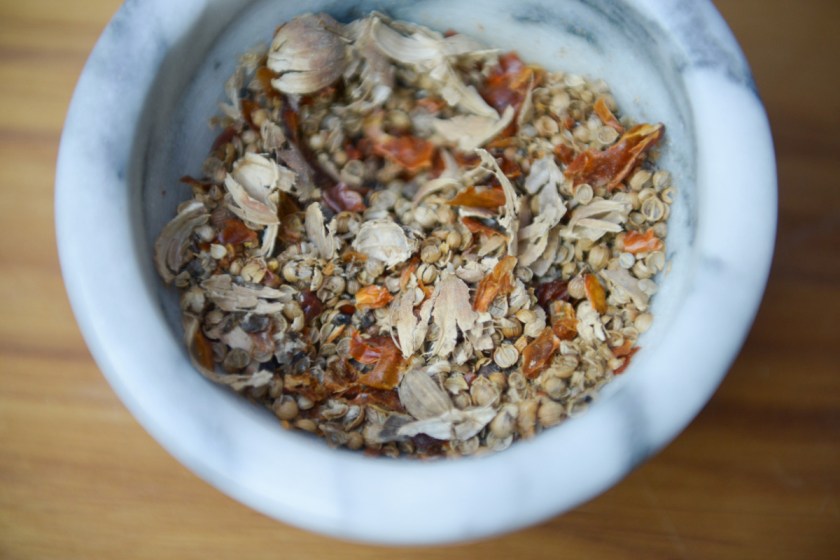 Start by making your curry paste. With a mortar and pestle, crush 4 tsp. of Coriander Seed with 12 whole Cardamom Pods.