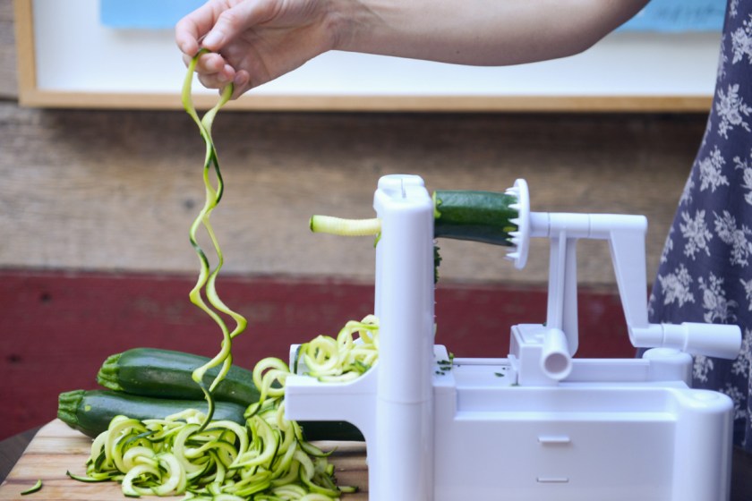 If you have a spiral slicer, spiral slice the 6 zucchini. There are many versions of this type of slicer online but this is the one I use: HERE It’s fun to use and the machine gives you long spiral “noodles” that are delightful to eat!