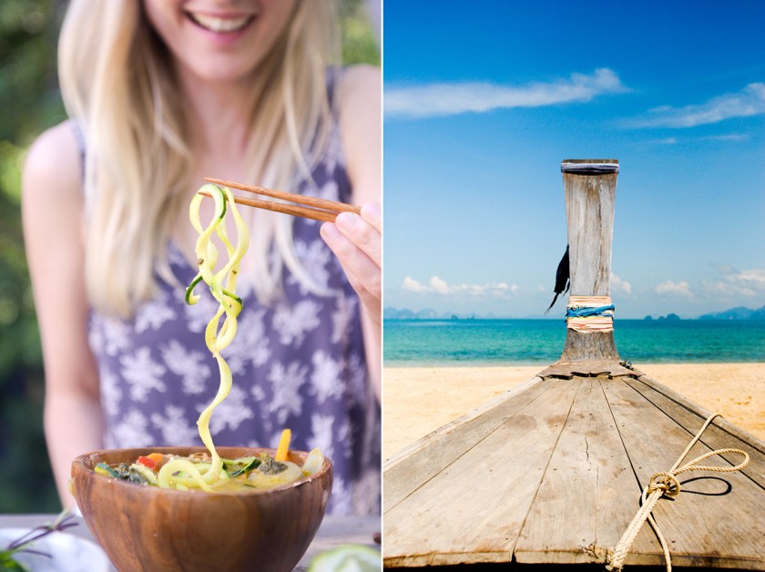 Just the simmering aromas wafting from my stovetop remind me of my trip to Thailand in 2011. Thailand had just experienced its worst flooding in over 50 years and I almost canceled my trip. But with a non-refundable ticket, I listened to an inner nudge that said to go on an adventure…and magic followed. I will always associate Thai Food with comfort because of the experiences I had on that trip. The kind, joyous people I met over lemograss-steamed fish when we stayed in a treehouse bungalow overlooking the crystal blue ocean. Snacking on green curry fried rice while walking underneath a sky aglow with 1000 floating lanterns. Drinking from coconuts on the white sand beaches of Koh Yao Noi. Stuffing myself on a buffet of Thai delicacies after feeding and bathing beautiful majestic rescued elephants in a rain forest reserve near Chaing Mai.