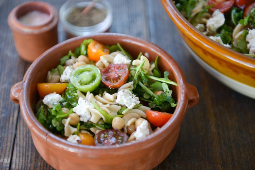 *I like to use all organic ingredients, but that’s up to you. This salad can also be made with regular pasta for those who eat wheat. I prefer corkscrew pastas, but feel free to experiment. For vegans, simply skip the goat cheese for a delicious gluten-free vegan pasta salad.