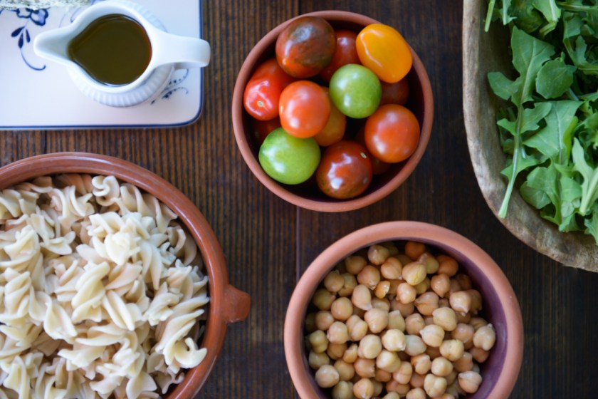 In a large bowl, toss in your pasta, garbanzo beans and tomatoes. Salt and pepper to taste, but go easy on the salt since the goat cheese will add more saltiness too. Grind a healthy covering of everyday seasoning on top and drizzle with extra virgin olive oil. Toss together.