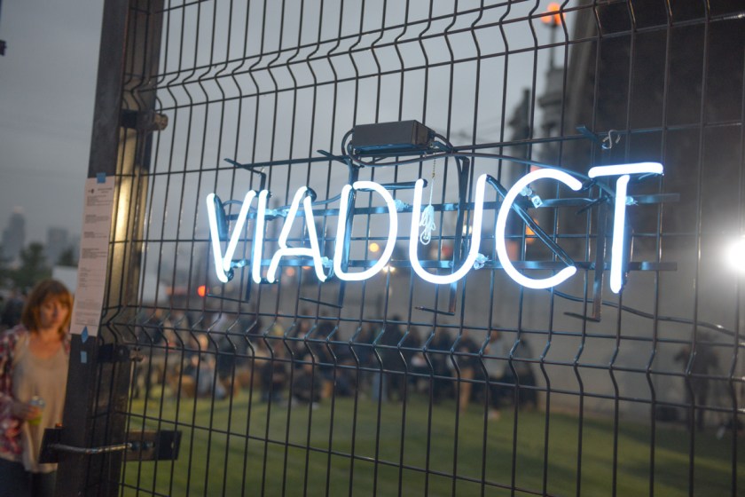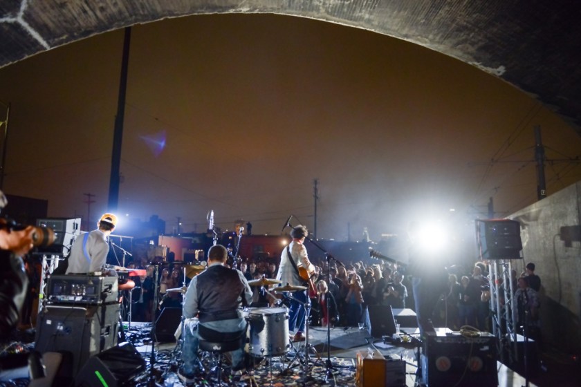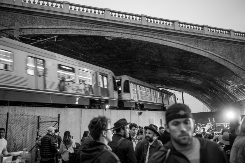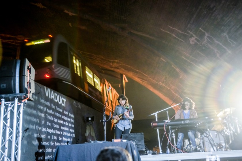 In a far corner of Los Angeles State Historic Park’s seemingly abandoned neighborhood, large art sculptures made of reclaimed materials dot the path to a nondescript opening in an iron fence with only one glowing neon “VIADUCT” sign to light the way. It certainly feels like you’ve followed the cement-brick road to some strange urban Oz. Luckily, the gatekeepers here are friendly and let you in as long as you have your ticket—no riddles required. Inside the small open-air event space tucked directly beneath the Buena Vista Street Bridge with the MTA line whizzing overhead and the Downtown LA skyline sparkling and shining just off in the distance, you almost start to second guess if perhaps you are here to see the Wizard…