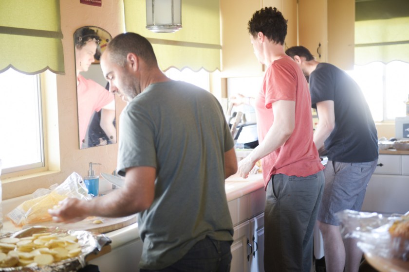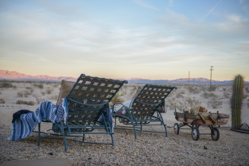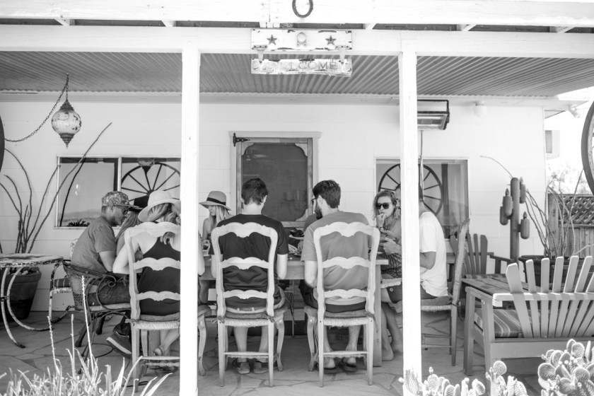 But our absolute favorite desert pastime is cooking and sharing big family meals together. Everyone brings groceries to load up the fridge with provisions for the weekend. (Stopping at Hadley’s natural foods on the way in is always a foodie’s delight on any East Desert road trip.) Throughout the weekend, everyone takes turns making meals, again with one simple rule: if you cook, you don’t clean. On our first morning, the fellas all pitched in to make a giant birthday brunch in celebration of Scoundrel Travis that was insanely delicious: eggs loaded up with fresh veggies, roasted potatoes and peppers, thick-cut bacon and huge chunks of avocado to top it all off. Having a giant family breakfast all together on the porch, wagon wheels framing the endless desert horizon with no other buildings in sight, old timey music humming along in the background, that feeling of absolute timelessness took hold and washed over us. Surely there was nowhere else to be, nothing else to do, no other place that even existed outside of this little desert bliss.