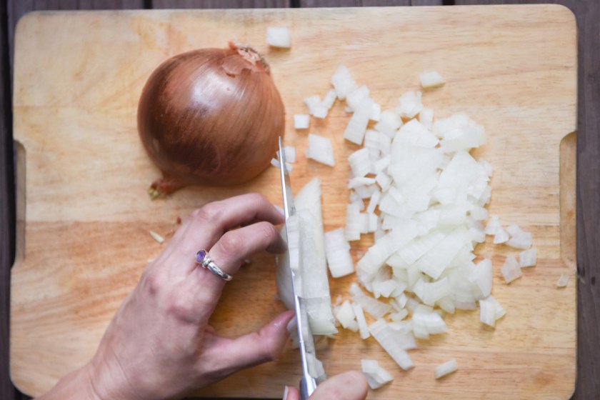 Dice the onion into small pieces. Set aside. You can make your own breadcrumbs by chopping a loaf of bread or gluten-free bread in a food processor. Grate the Swiss cheese. Set aside.