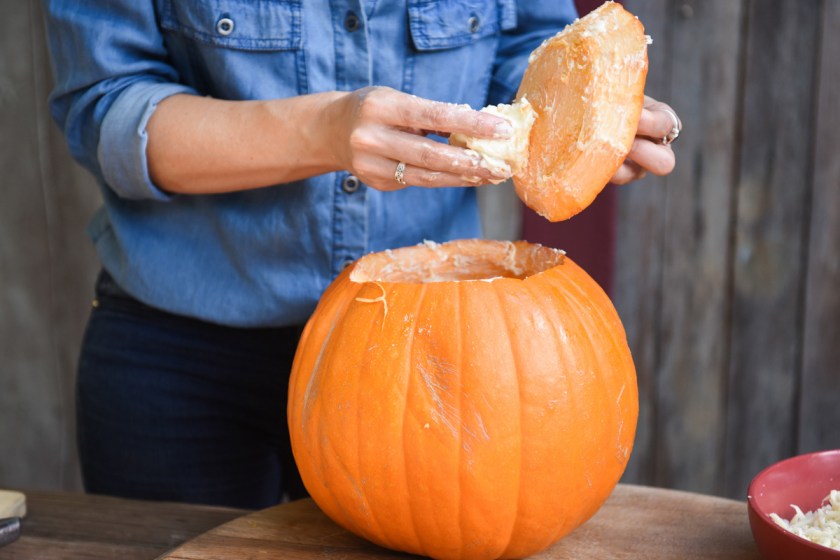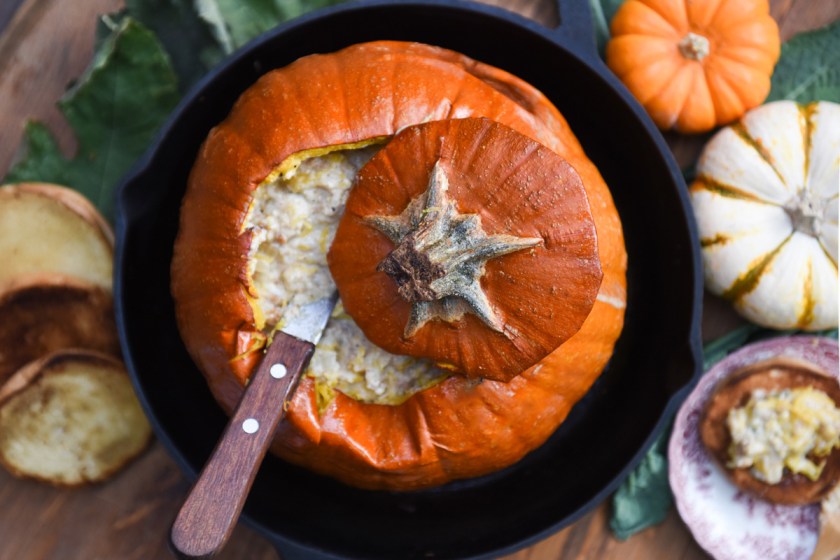 Starting with Halloween and ending on New Year’s Day, the Holidays are a whirlwind of feasts and gatherings. I recently attended a Halloween Potluck Pumpkin Carving hosted by the best hostess and foodie, the lovely Hayley McCarthy (who was previously featured over the summer in my camp cooking article with her delicious gluten-free Banana Fritters recipe: HERE). For this festive gathering of costumed guests ready to show off their pumpkin carving skills, Hayley baked the most perfect, comforting and gorgeous Holiday dish I had ever seen! As she stepped out of the kitchen dressed in true Halloween fashion as Rosie the Riveter, her Baked Pumpkin Fondue was greeted with oohs and aahs and tasted even better than it looked–if that is even possible. Hayley made this special dish gluten-free to make sure I could partake. As soon as I tasted it, I could not wait to share this recipe with you! It’s absolutely the perfect Holiday dish and a wonderful way to use those leftover pumpkins you have been using for your fall decor. I’m so happy to feature this recipe share from one of my favorite foodies.