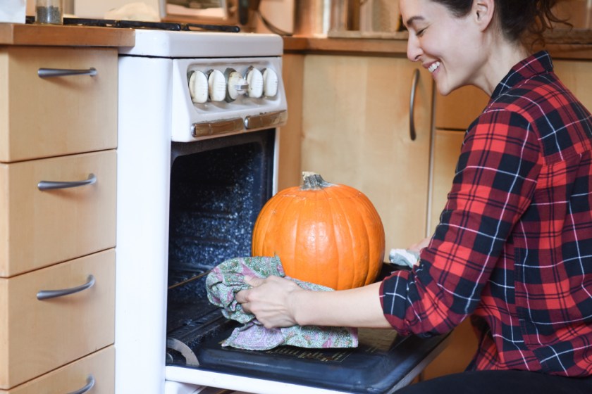 TIP: If the pumpkin becomes too brown on the outside after the first hour, you can wrap foil around the outside while it still cooks the inside.