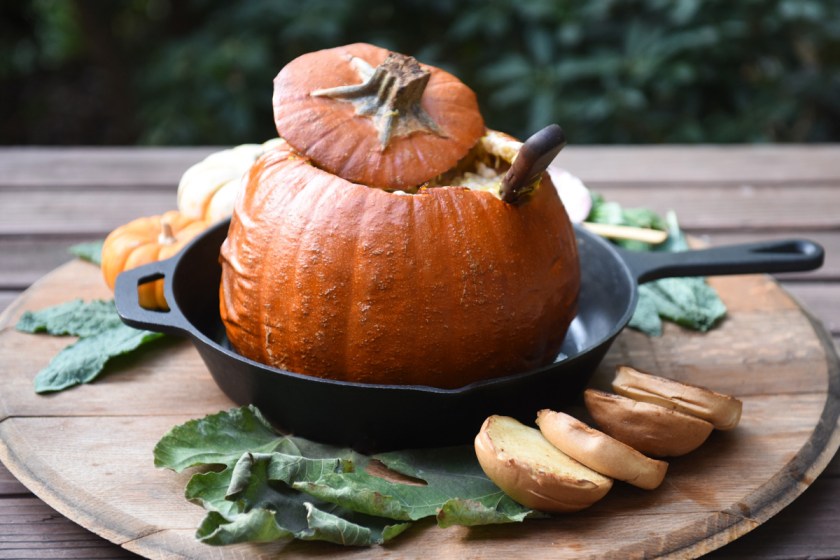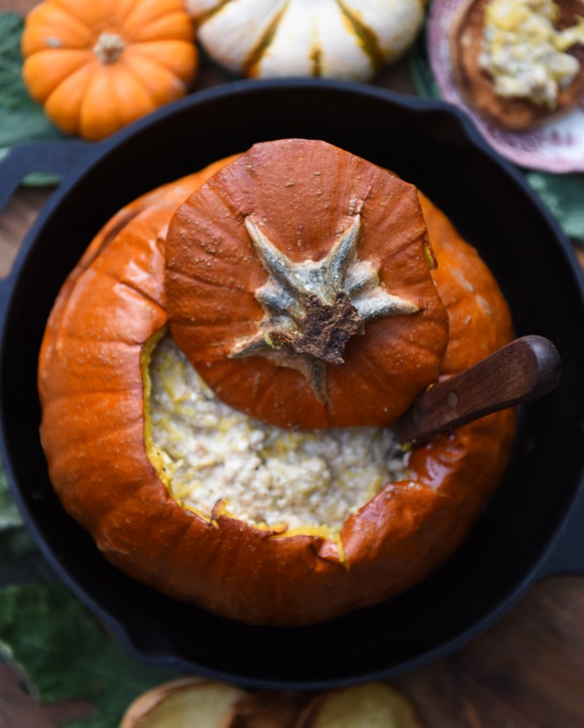 Place your pumpkin on an iron skillet or a sturdy baking dish. Spoon the mixture into the hollow pumpkin. Pour the cream into the pumpkin, adding the bay leaves. Gently stir the mixture and place the pumpkin lid back on top!
