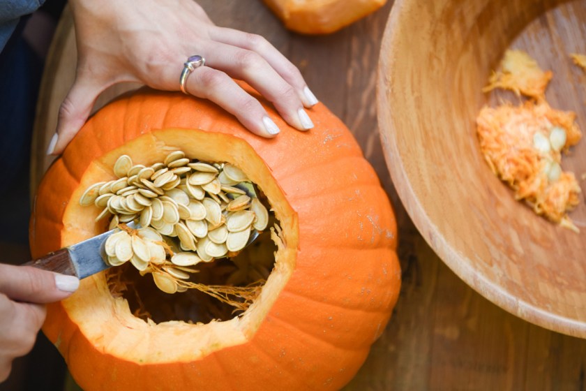 TIP: If you have time, set the seeds aside. Later you can separate the seeds from the stringy flesh and toss them in a little olive oil and spices. Bake the pumpkin seeds in a single layer on a cookie sheet at 300° for 45 minutes…delicious!