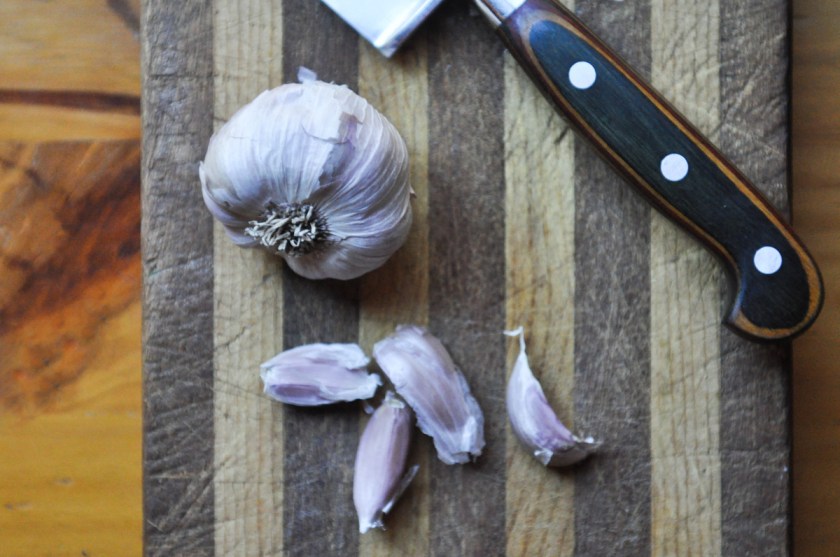 My Korean, Czech and Texas roots have engrained in me the need to use garlic in almost every savory dish I make. It can be very time consuming to peel those little cloves clean. There are two ways I like to peel garlic. If I need a clove or two, I place the flat side of the blade of a large knife over a clove and pound down with the butt of my hand. After they are crushed, the peel easily falls off and they are halfway to being already minced. I finish off mincing the garlic with the knife.