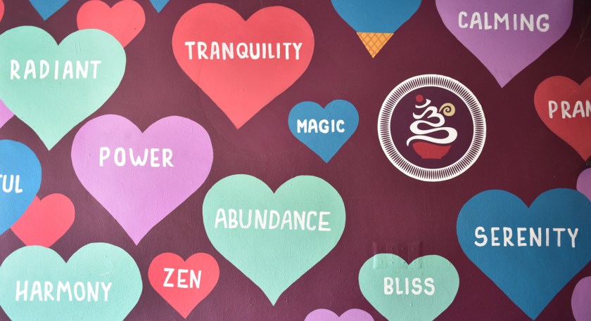 This brings us to Yoga-urt at the heart of Kenneth Village—a happy haven of healthy yumminess where all are welcome, including your dogs, babies, dog babies or all of the above. Colorful hand-painted hearts cheerfully display affirmations like “abundance”, “serenity” and “bliss” as you enter, letting you know what joy awaits just on the other side of the door. Speaking of bliss, have you ever seen a grown man do a happy dance and sing to himself in his chair privately as his first response to taking a bite of ice cream? Have you witnessed multiple grown adults with histories of food allergies sob with awe, delight and eternal gratitude that delicious soft serve can now be a reality for them again? Like, actual real streaming tears? We have. Right here. When we say Yoga-urt brings joy, we mean it on the deepest level. It’s not something that can even be described. You have to just taste it to know it.